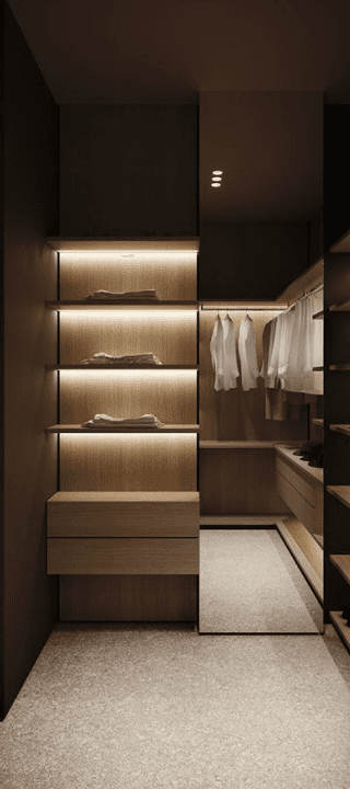 Design and implementation of a custom wardrobe extension with integrated storage and lighting solutions.